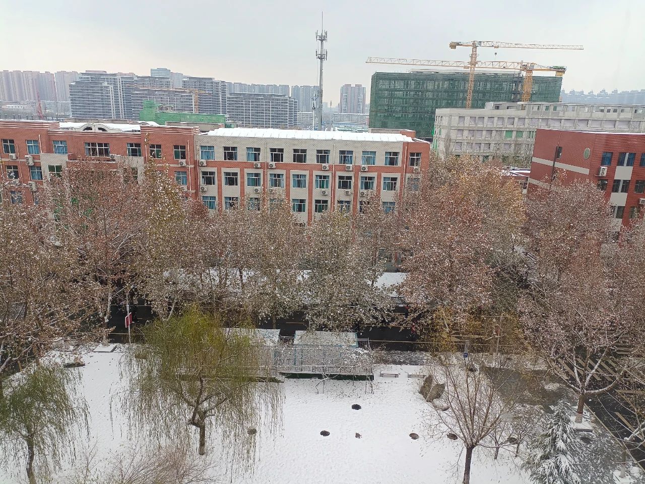 河工校园与冬日初雪撞了个满怀。