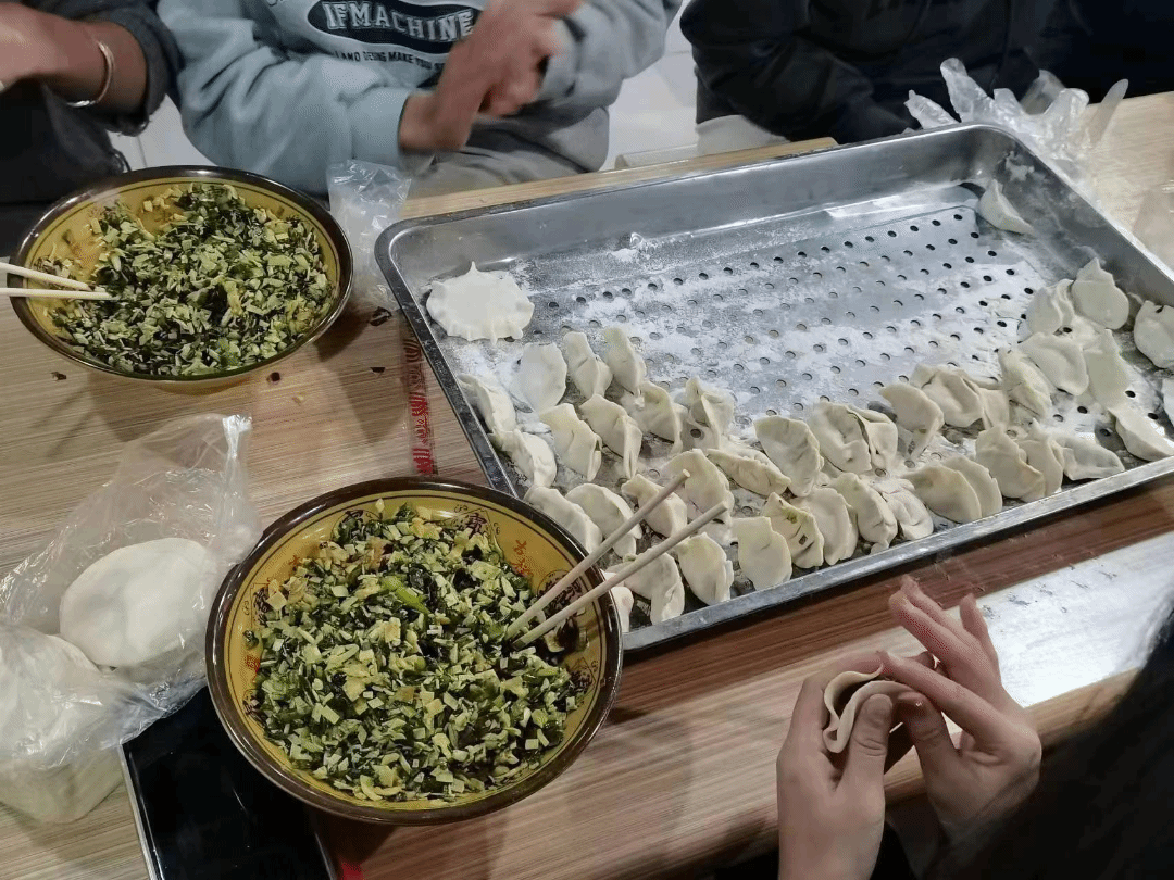 食堂的工作人员早早的就准备好了包饺子的材料,饺子皮和饺子馅儿。活动中,大家各自分工,协助动手。在包饺子的过程中,同学们聊起了冬至的来历和习俗。其中包括了张仲景医生来制作祛寒娇耳汤的故事,原来小小的饺子里蕴含着我国深厚的民族文化,同生们相互切磋包饺子的技巧,分享生活和工作中的琐碎日常,其乐融融,温馨欢乐的气氛油然而生。
