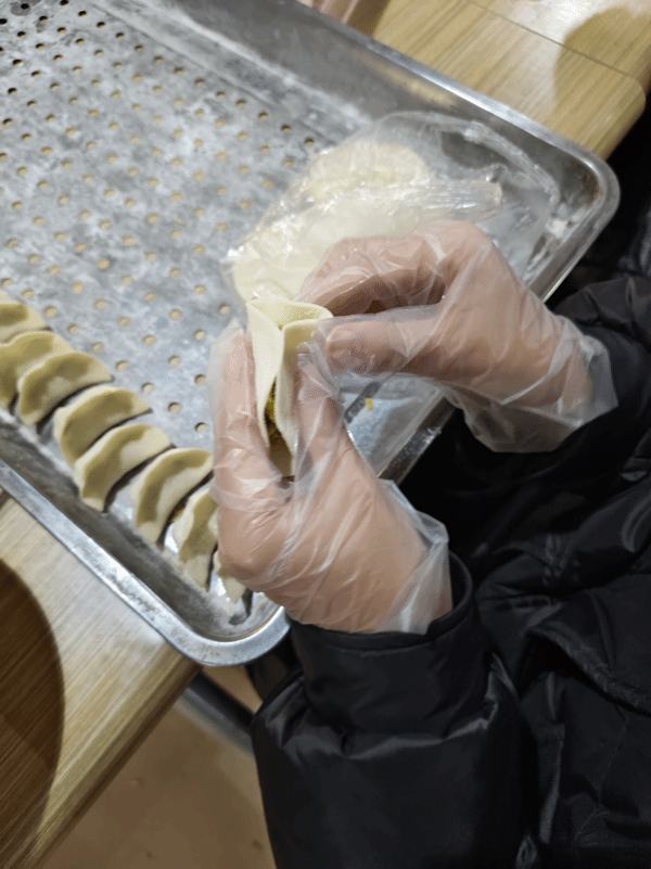 在包饺子过程中,同学们你一言我一语。托住饺子皮、取一勺饺子馅、捏好饺子皮、一个个个性十足的饺子就诞生了。同学们别出心裁的把饺子包成各种形状,饺子的摆放也错落有致,别具艺术气息。各个地方包饺子的方法不同,不同地域的同学也相互传授包饺子的经验,现场气氛格外热闹,经过共同努力,各式各样的饺子呈现在大家眼前。