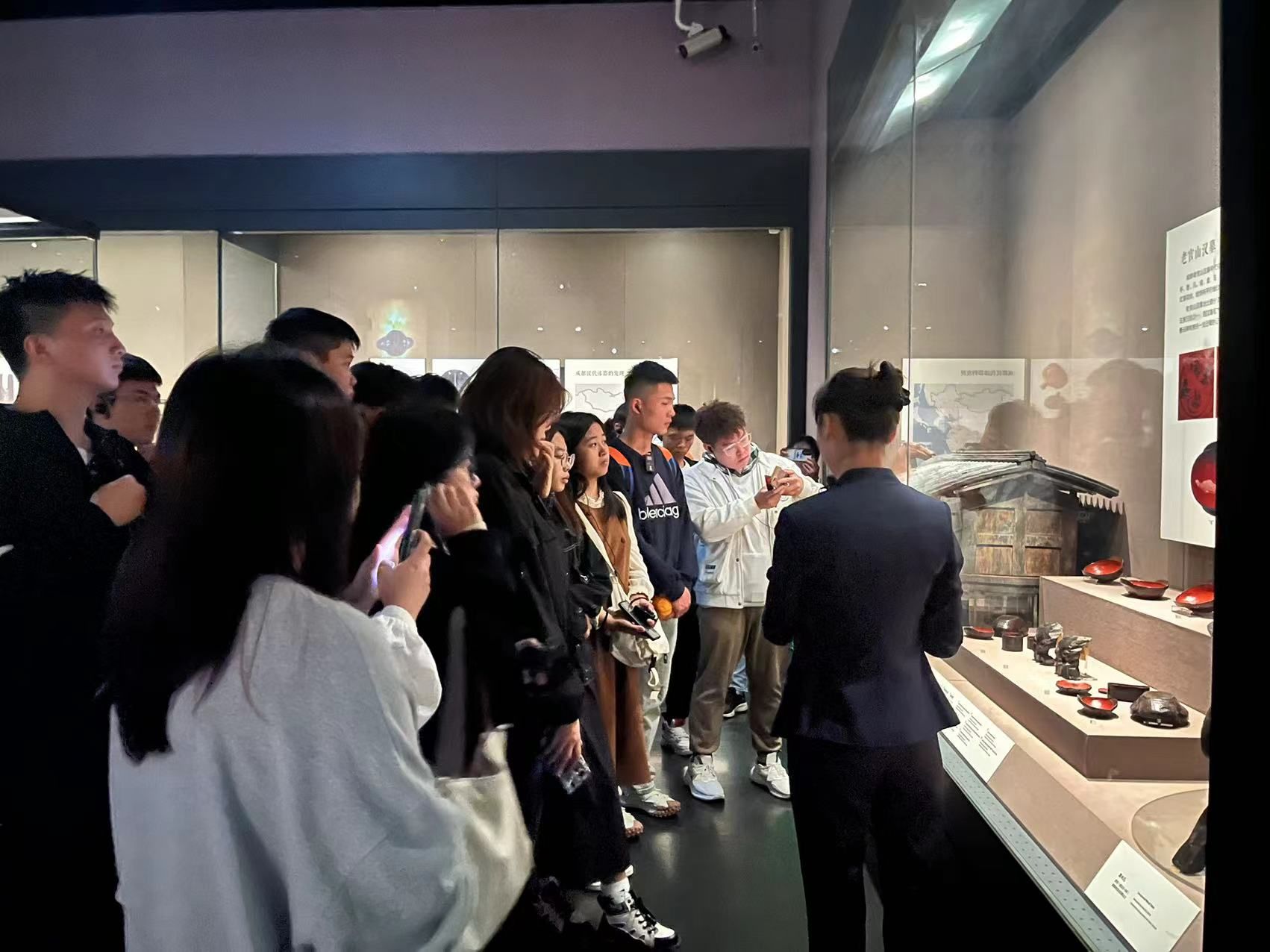 (同学们认真参观文物,学习展陈设计)