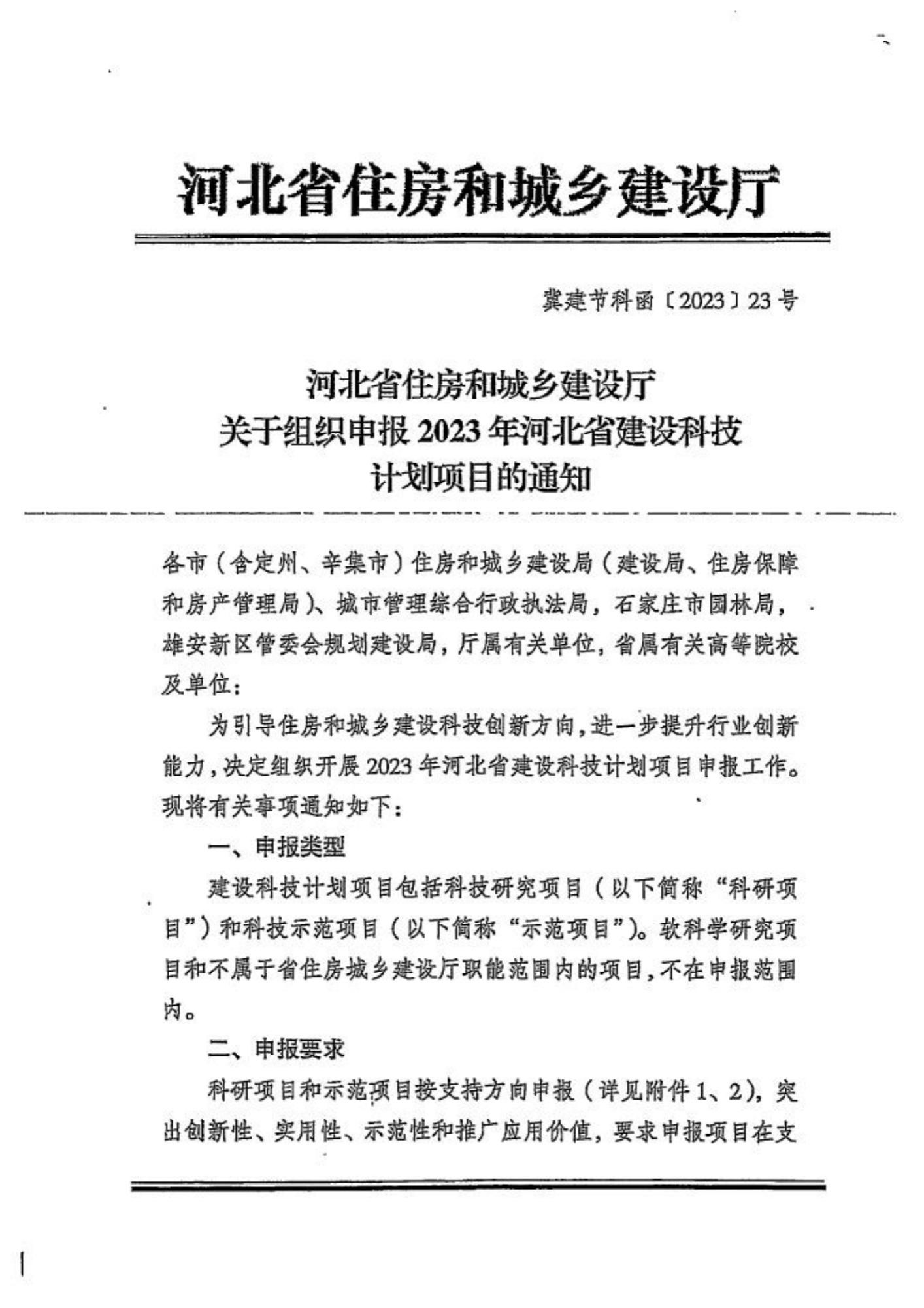 河北省住建厅关于组织申报2023年河北省建设科技计划项目的通知