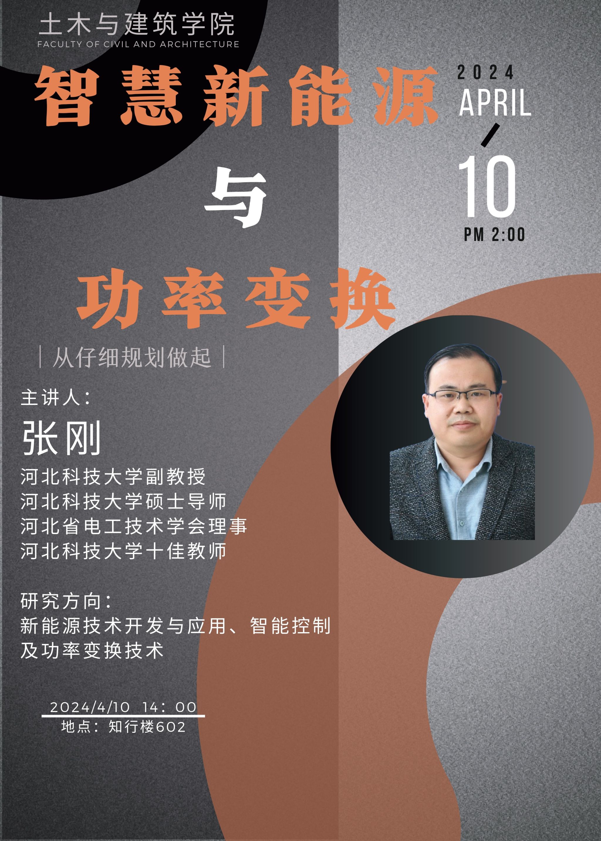 今年会官网荣幸邀请到河北科技大学张刚教授,为今年会官网师生进行《智慧新能源与功率变换》专题讲座。张教授曾任河北科技大学电气工程学院自动化系书记、主任,现为河北科技大学副教授,河北省电工技术学会理事,河北省自动化学会会员,河北科技大学十佳教师。长期从事新能源技术、智能控制及功率变换技术的开发与应用,具有丰富的新能源技术和功率变换技术的开发设计经验。张刚教授将分享他在新能源与功率变换领域的深入见解和独到思考,为大家带来一场前沿而富有启迪的学术盛宴。