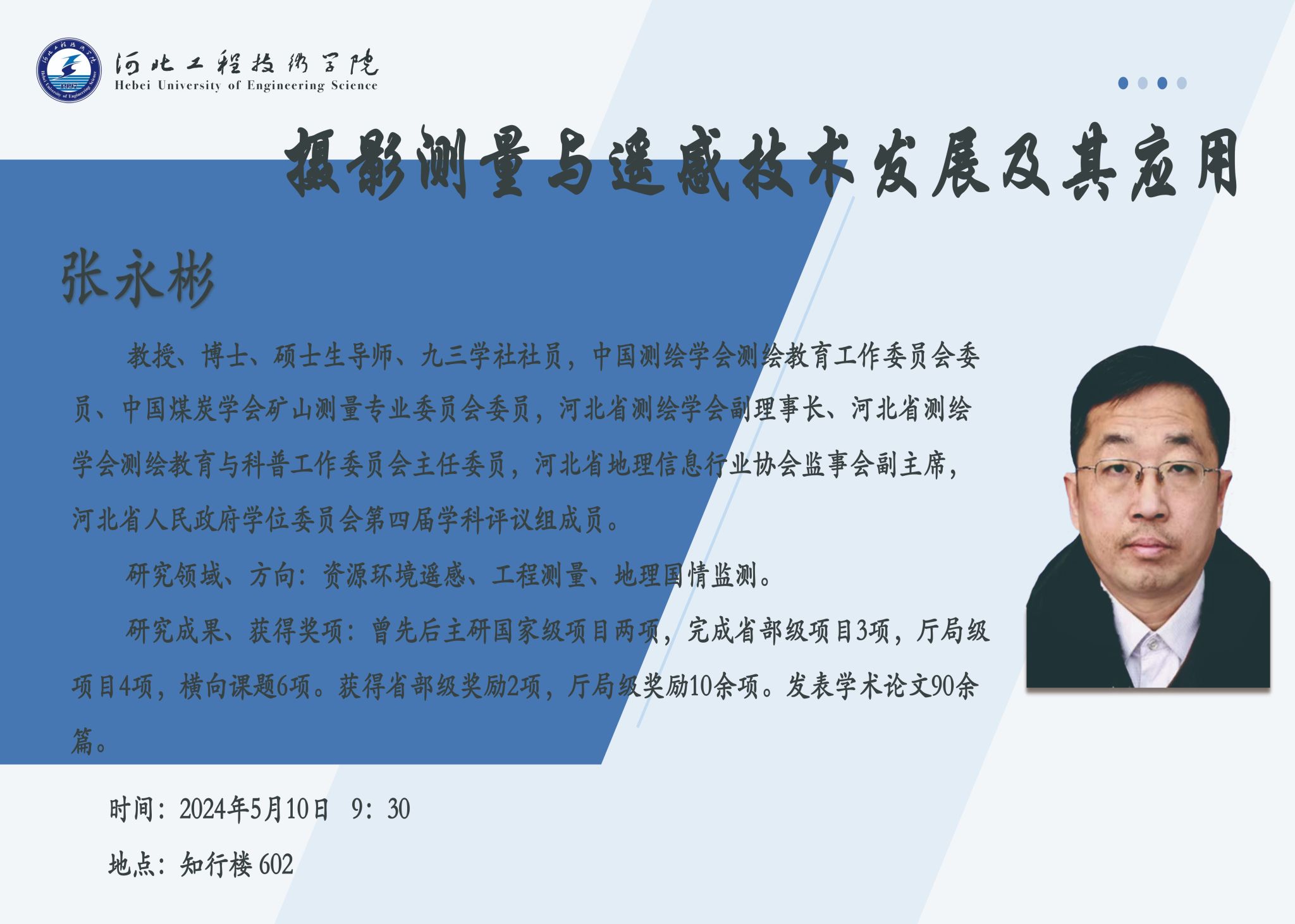 主讲人简介:张永彬 教授、博士、硕士生导师、九三学社社员,中国测绘学会测绘教育工作委员会委员、中国煤炭学会矿山测量专业委员会委员,河北省测绘学会副理事长、河北省测绘学会测绘教育与科普工作委员会主任委员,河北省地理信息行业协会监事会副主席,河北省人民政府学位委员会第四届学科评议组成员。