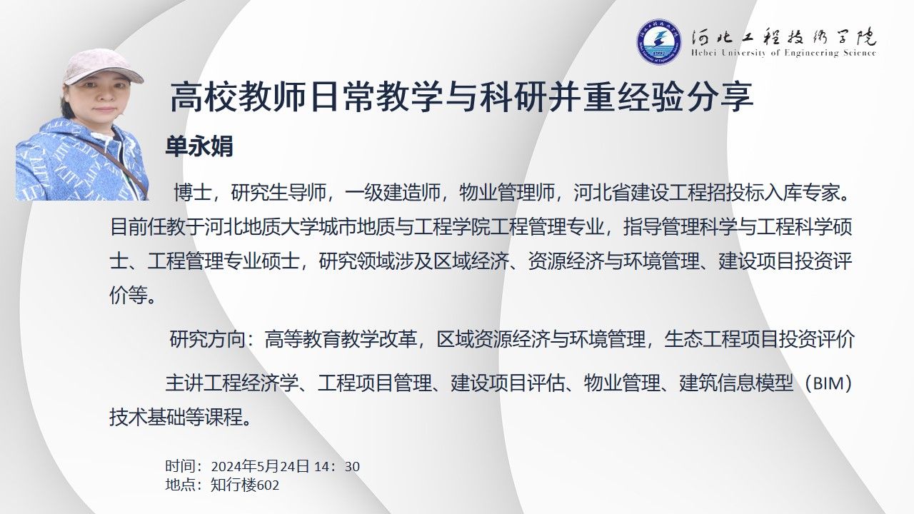 主讲人简介: 单永娟 博士,研究生导师,一级建造师,物业管理师,河北省建设工程招投标入库专家。目前任教于河北地质大学城市地质与工程学院工程管理专业,指导管理科学与工程科学硕士、工程管理专业硕士,研究领域涉及区域经济、资源经济与环境管理、建设项目投资评价等。