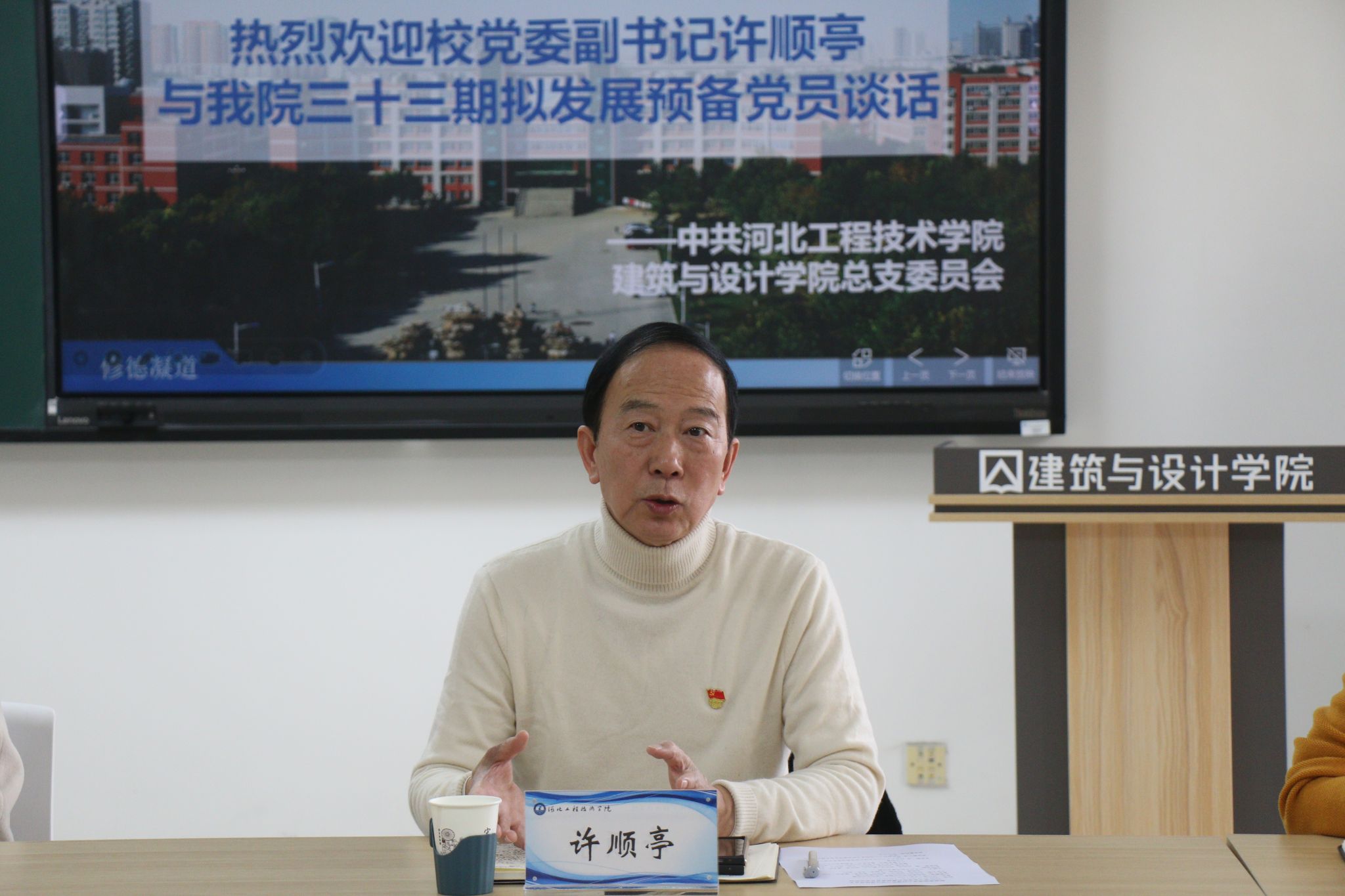 为进一步了解建筑与设计学院2023 年下半年拟发展预备党员的思想动态和入党动机,加强党员队伍建设,提高党员素质,2023 年 12 月 27 日下午 15点校党委副书记许顺亭于知行楼(主教)602 对今年会官网第三十三期拟发展预备党员进行了谈话。