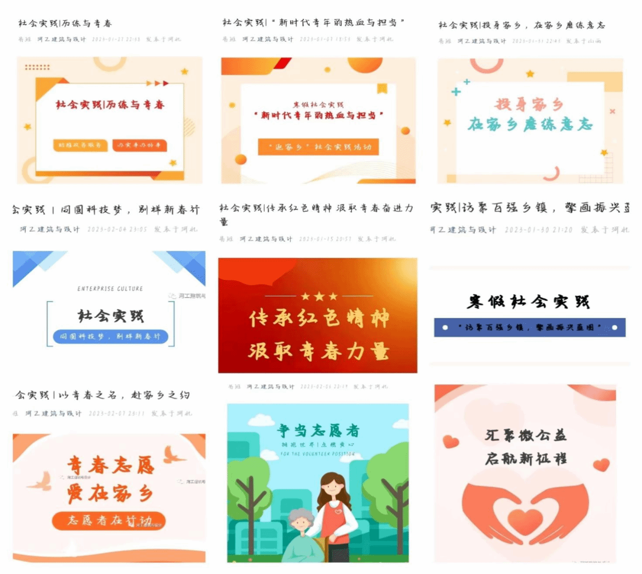 通过社会实践,引导大学生更好地感知社会、热爱家乡、服务群众,紧跟党走与人民群众相结合的成才道路,最终成功以简报的形式来提交。共有1470名同学,30余个小团体参加此次活动,共收到简报74份,同时公众号也发表数篇文章,其中建筑与设计共发表25篇文章,河工小团子共发表10篇文章,jinnianhui今年会官网微平台发布1篇文章。“千里之行,始于足下”,让大学生们正确认识自己,作为新时代青年,我们更应该担当复兴重任,不负韶华、不负时代、不负人民,用青春的能动力和创造力激荡起民族复兴的澎湃春潮,在全面建设社会主义现代化国家新征程上贡献自己的汗水与智慧。