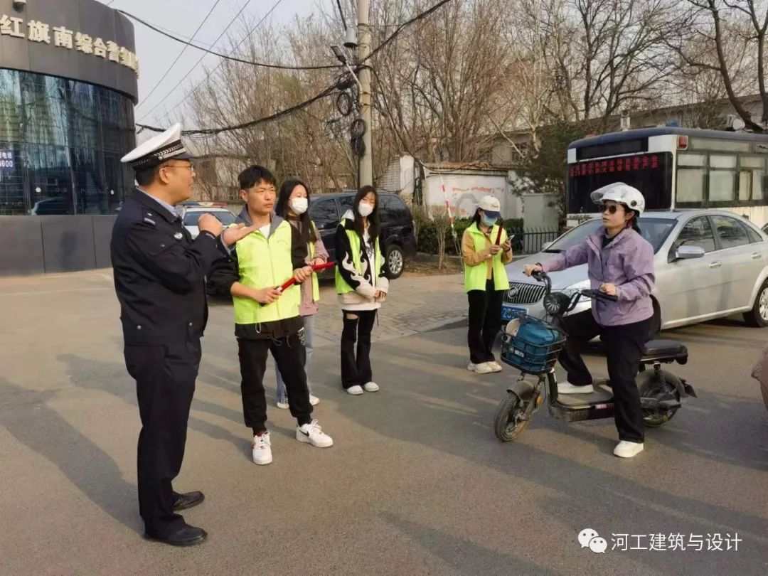 为进一步呼吁广大市民规则出行,2023年3月28日下午4点,文明交通志愿者们身穿印有建筑与设计学院标志的马甲,由青协负责人徐帅带队,步行至桥西区红旗大街南综合警务室协助交警进行交通秩序整治及宣传活动。
