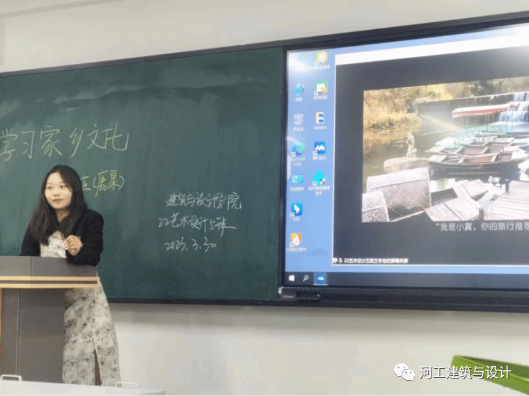 鹿泉奋进新时代,人才逐梦展胸怀。为了促进班级同学的团结,了解来自各地独有的家乡文化,今年会官网建筑与艺术学院2022级艺术设计5班同学于2023年3月30日星期四在主教606举办“一班一品”主题活动,由班长和副班长组织做好准备工作,要求同学们准时到达教室,班会于晚上7:00正式开始。同学们在教室做好准备,本次活动由王冬怡同学进行分享她的家乡——石家庄鹿泉,由宣传委员进行拍照。活动开始,王冬怡同学进行对鹿泉的简单介绍。