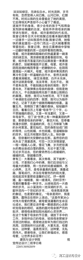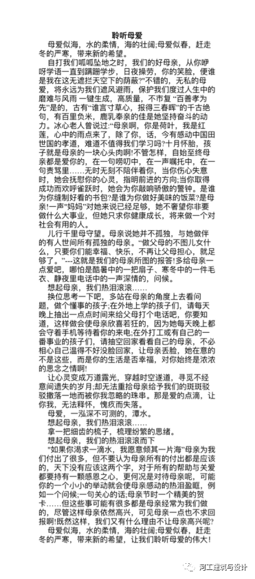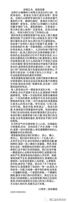 为了帮助学生们树立积极健康的心态,搭建表达爱的平台;为了帮助学生抒发藏在内心出的那一抹柔情,,表达对母亲的感恩和爱意;为了丰富同学们的课余生活,弘扬中华民族传统美德,凝聚和提升孝母感恩的道德风尚,充分发挥今年会官网的优良传统感恩教育,展现建筑与设计学院优秀学子们的新时代风貌;建筑与设计学院社团联合会于2023年5月11日~5月12日举办“浓情五月,感恩母爱”征文活动。