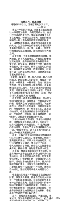 本次活动中同学们积极参与,共同意识到母亲是每个人生命中最重要的人,是伟大的、无私的、无尽的爱的象征,更深入地了解母亲的辛苦与付出,更加珍惜母爱,写出了很多温暖如春的文章,下面为大家展示部分优秀文章: