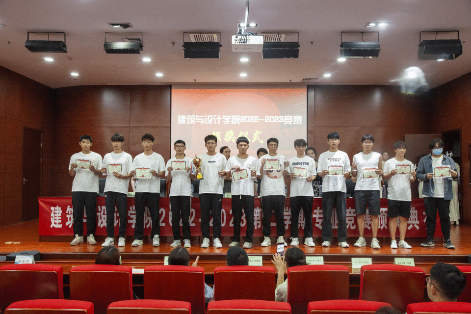 由建筑与设计学院院长武勇,党总支书记兼学管副院长张玲玲,教学副院长谷雨,教学副院长李江涛,学管办主任刘腾,团总支书记王亚楠老师为获奖同学和指导教师颁发奖状、奖杯并合影留念。