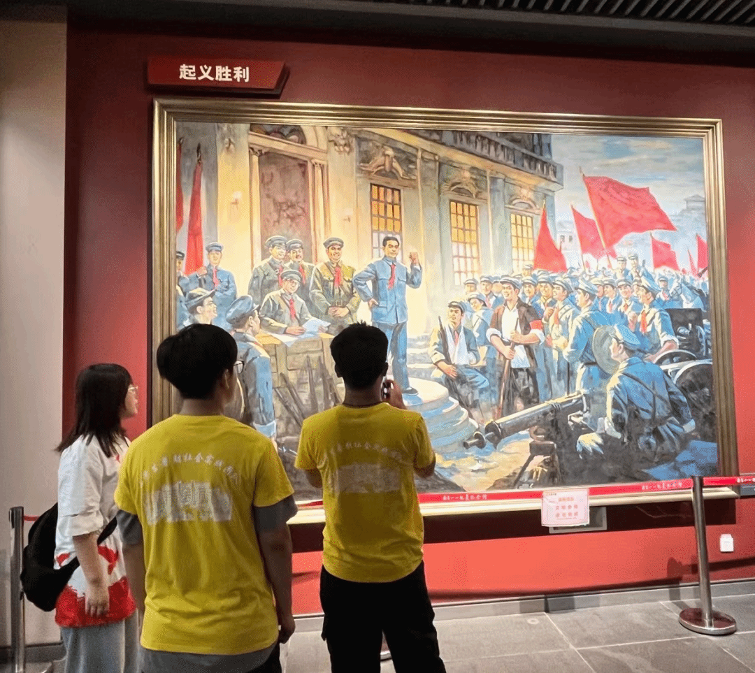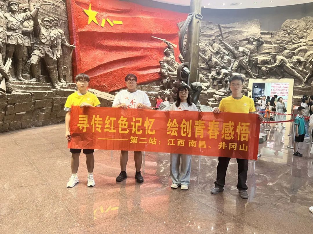 重温八一历史,赓续红色薪火。第二站走进南昌八一起义纪念馆,感受英雄的红色血脉。纪念馆蕴藏着丰富的历史文化和红色文化资源,是开展爱国主义和革命传统教育,培养社会主义核心价值观的重要资源。在这里,实践队员们瞻仰了鲜艳的八一军旗,历经硝烟炮火的枪弹武器、信函刊物、生活器具等珍贵文物,它们正安静地放在纪念馆陈列展柜里,无声诉说着峥嵘岁月里的红色故事,见证着军旗升起与人民军队的诞生和发展壮大。在参观过程中,实践队员们或凝视、或交流、或记录,被革命先烈的爱国情怀和坚定信仰所感动。实践队员李浩泽感慨道:“我很荣幸参加此次活动。来到八一起义纪念馆,仿佛自己能回到那个弥漫战火的时代,眼前浮现红军们浴血奋战,英勇杀敌的场景,耳旁响起中共打响武装反抗国民党反动派的第一枪。革命前辈们的英勇作战和革命精神,这种精神让人感受到热心沸腾和奋斗的冲动。作为一名新时代大学生,不仅仅要了解历史,更要激励自己的爱国热情和奋斗精神,更加坚定为实现中华民族伟大复兴而奋斗的信念。寻访红色记忆,赓续红色血脉,传承红色精神,向革命先烈致敬!