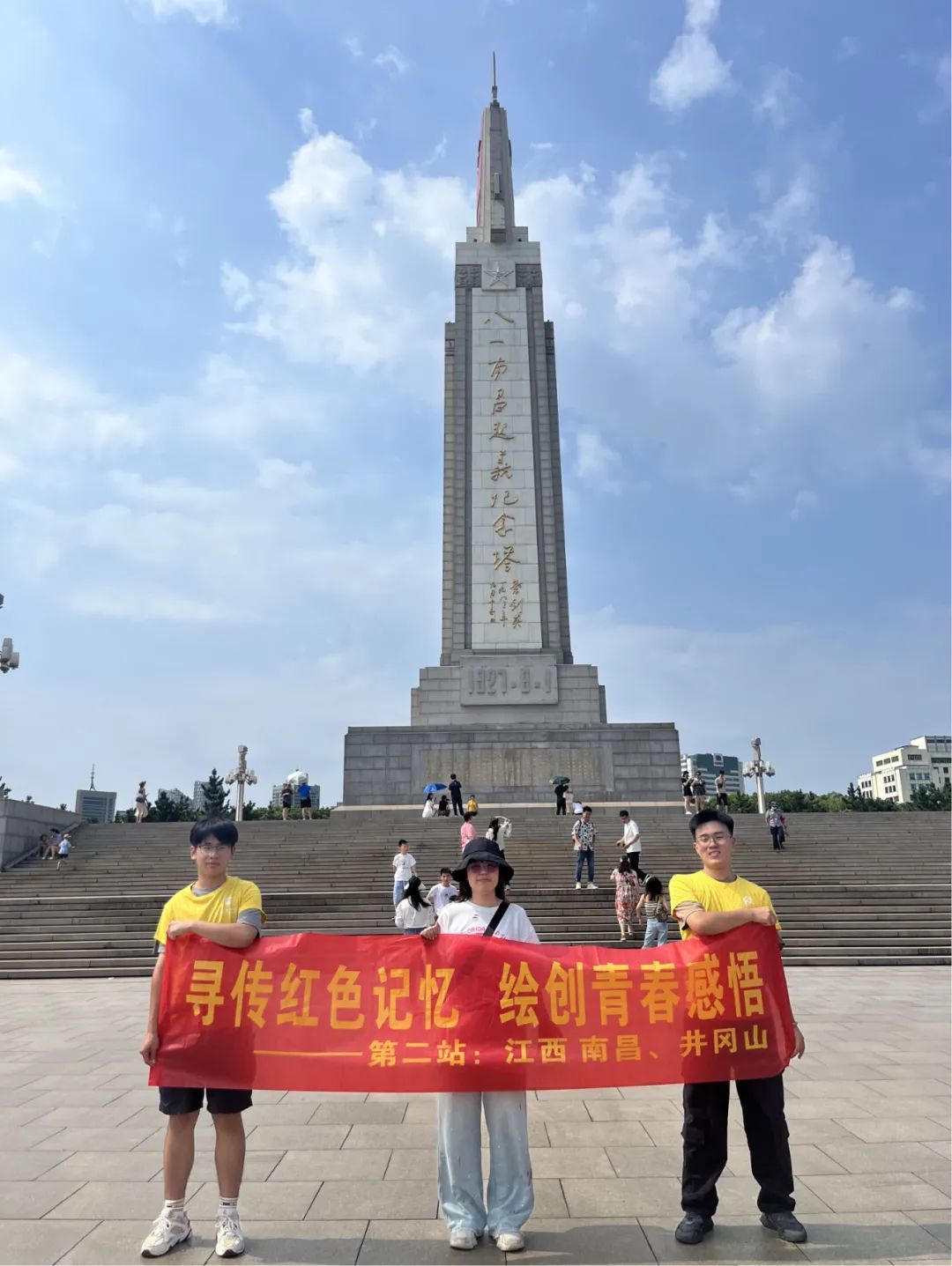 传承红色基因,铸就红色青年,建筑新青年在行动。辅导员张亚薇老师带领实践队员们首先来到了八一广场,八一广场伫立着由叶剑英元帅题写的“八一南昌起义纪念塔”,塔身还刻着七个鎏金大字——八一起义纪念碑,塔基刻有三面浮雕,栩栩如生,仿佛让我们走进了那个充满炮火的年代。此广场为纪念1927年8月1日爆发的八一起义而建设的,南昌起义打响了武装反对国民党反动统治的第一枪,揭开了中国共产党独立领导武装斗争和创建革命军队的序幕。雄伟挺拔的南昌起义纪念塔在阳光的映衬下让人,格外的醒目。由巨型花岗石雕汉阳造步枪与红色花岗石雕八一军旗拼贴而成的塔顶彰显着创建人民军队的意志与决心,指引着人民军队前进的方向。现在作为一名大学生,能力有限,但我们却能通过自己力所能及的方式让更多的人了解八一红色文化,体会八一精神,在了解的过程中逐渐认识到红色文化传播所遇到的问题。