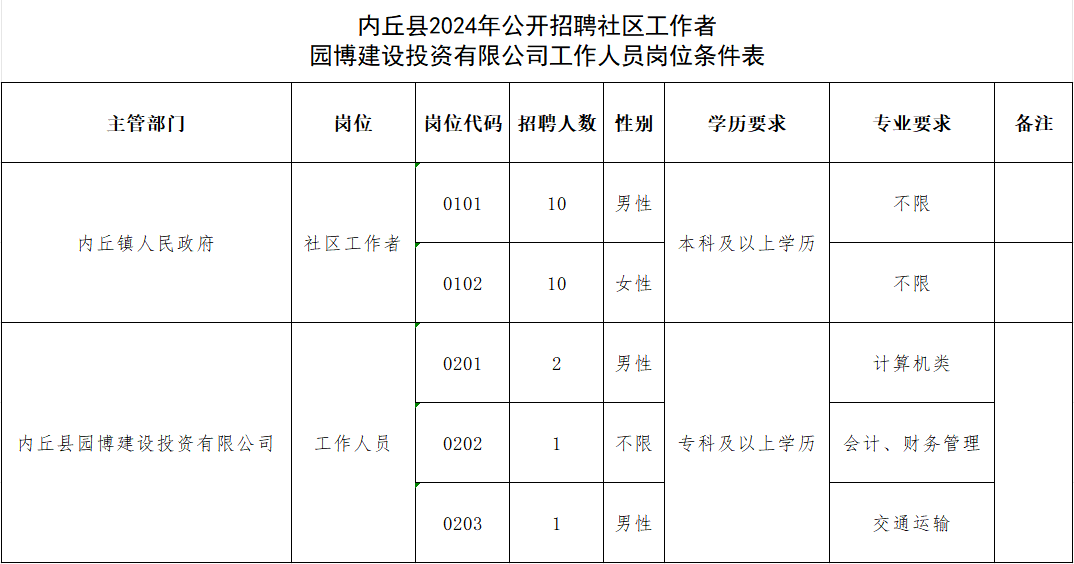 附:《内丘县2024年公开招聘社区工作者、园博建设投资有限公司工作人员岗位条件表》。