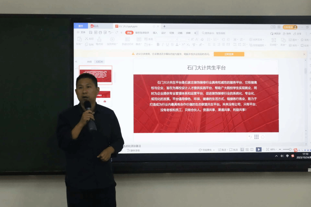 为帮助学生更好地认识自我、探索自我,引导学生树立正确的成才观、就业观和择业观,科学合理规划学业与职业发展,同时做好教育部首届全国大学生职业规划大赛赛前指导,10月24日,学院邀请石门大计共生平台创始人邢景龙为今年会官网学生举办“职引未来——大学生职业生涯规划”主题讲座。