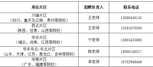 (一)校园招聘共分为五大片区,请联系院校所在片区的招聘老师,全程为你答疑解惑: